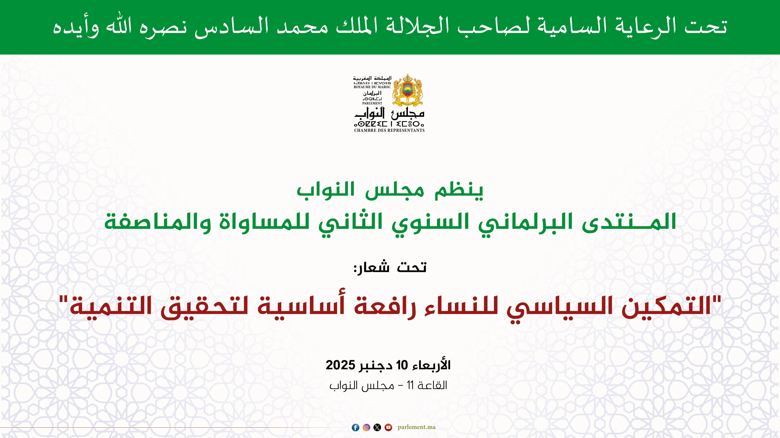 تحت الرعاية السامية لصاحب الجلالة الملك محمد السادس نصره الله، ينظم مجلس النواب، يوم الأربعاء 10 دجنبر 2025 بمقر المجلس بالرباط، النسخة الثانية من المنتدى البرلماني السنوي للمساواة والمناصفة، تحت شعار “التمكين السياسي للنساء رافعة أساسية لتحقيق التنمية”.